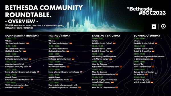 Für diejenigen, die nicht vor Ort sein können, bietet Bethesda ein umfangreiches Livestream-Programm auf twitch.tv/bethesda_de an. Täglich ab 14 Uhr (samstags ab 9 Uhr) wird direkt aus dem Bethesda Streaming-Truck gestreamt. Es erwarten die Fans unter anderem illustre Gäste wie die Astronautin Samantha Cristoforetti, Bethesda Head of Publishing Pete Hines, Sängerin Cristina Scabbia, ZOS-Präsident Matt Firor und viele mehr.