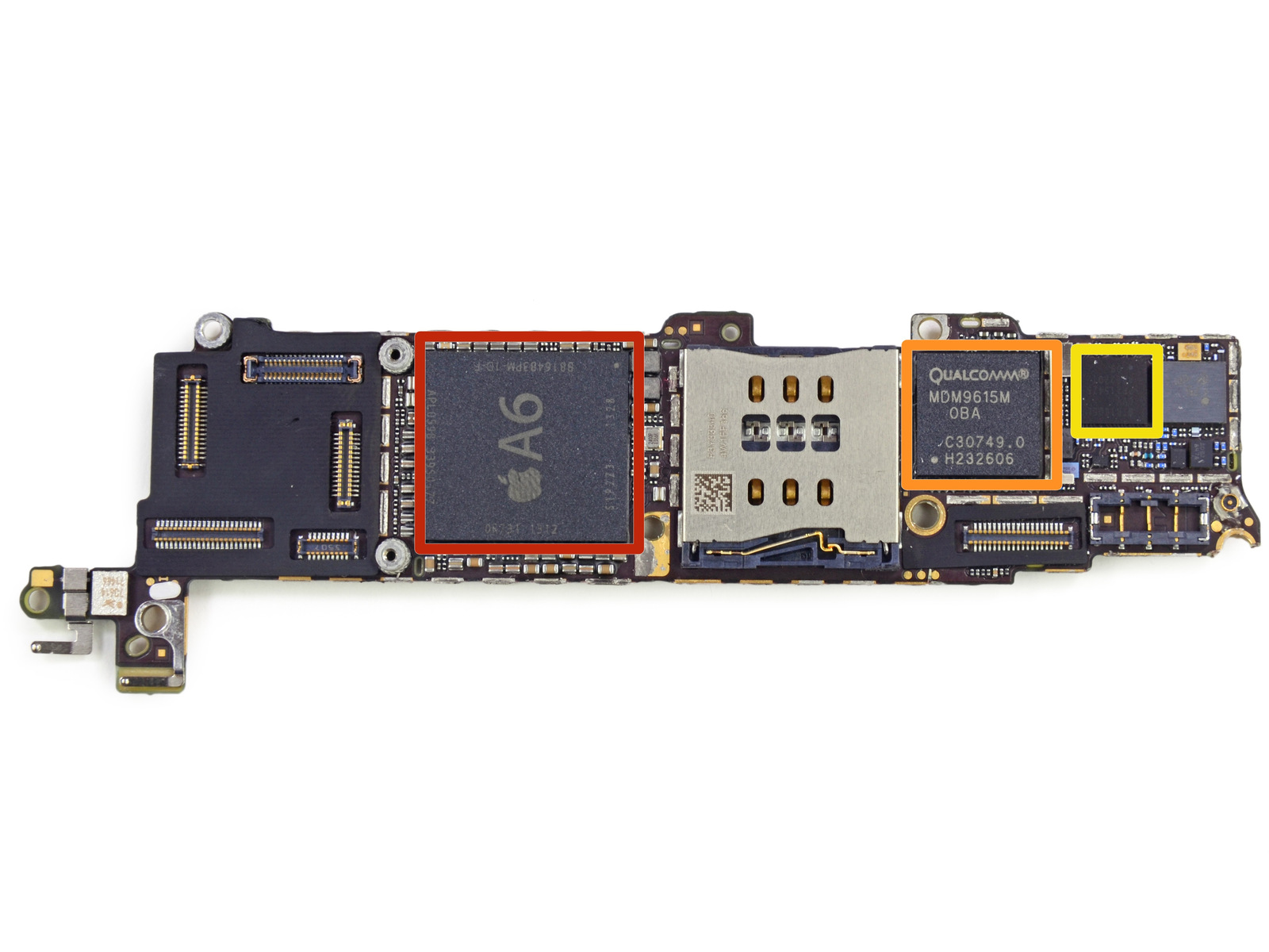 Welche Überraschungen schlummern aber noch im Inneren der beiden Smartphones? Das iPhone 5c ist grundsätzlich ein in buntes Plastik eingepacktes iPhone 5. Der Akku hat mit 3,8 Volt, 5,73 Wh und 1.510 mAh im Vergleich zur Batterie des iPhone 5 (3,8 Volt, 5,45 Wh, 1.440 mAh) etwas zugelegt. Als SoC findet sich der aus dem iPhone 5 bekannte Apple A6, flankiert von einem Qualcomm MDM9615M LTE-Modem. Hauptspeicher: 1 GByte DDR2 Elpida B8164B3PM-1D-F8.
