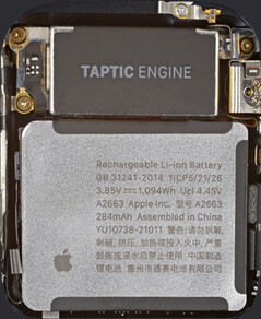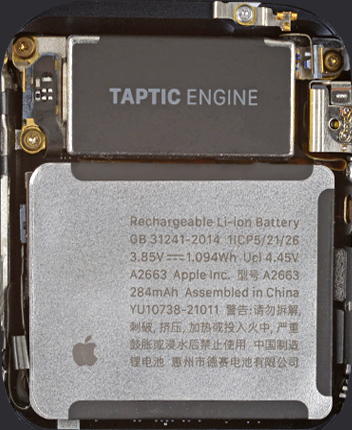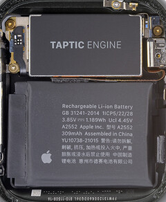 Auf den Fotos gibt es nicht viel zu sehen, denn neben der Taptic Engine, die als Vibrations-Motor dient, wird der Großteil des Platzes vom Akku belegt, der beim kleineren Modell in einem neuartigen Metallgehäuse sitzt. Das Röntgenbild zeigt weniger Komponenten als noch bei der Series 4, denn Apple hat den Diagnose-Port ersatzlos gestrichen und die Display-Kabel zusammengelegt, um zusätzlichen Platz zu sparen, der für größere Akkus genutzt wurde.