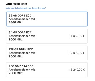 Während der iMac Pro bisher mit maximal "nur" 128 GB RAM bestückt werden konnte, hat Apple dieses Limit nun verdoppelt. Das hat aber seinen Preis: Das Upgrade von den standardmäßig installierten 32 GB kostet stolze 6.240 Euro.