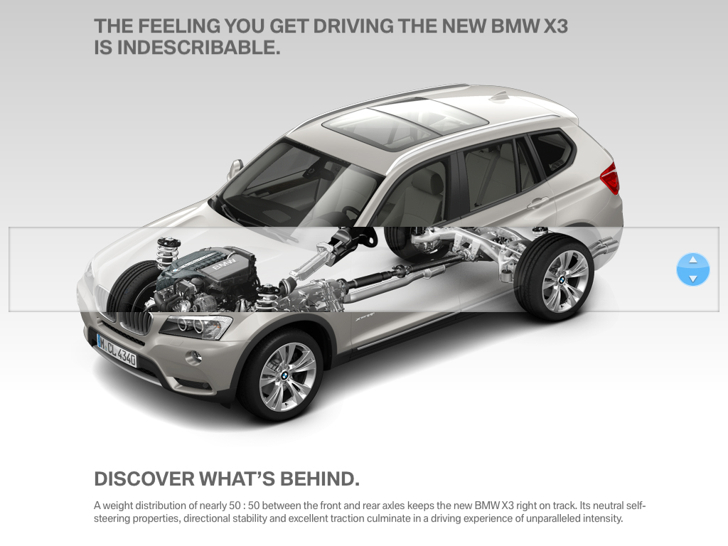 Die X3-Applikation von BMW vereint die Vorteile aus dem klassischen Produktkatalog, dem Internetauftritt und den interaktiven Möglichkeiten des Apple iPads. Die BMW X3-App bietet neben reichhaltigem Informations- und Videomaterial auch die Möglichkeit, sich via Touchscreen sein Wunschfahrzeug individuell zu konfigurieren und Produktliteratur zu bestellen. Zu den Highlights der Applikation gehört eine interaktive 360°-Ansicht. Sogar Testfahrten kann der Kunde direkt mit BMW über ein integriertes Formular vereinbaren.