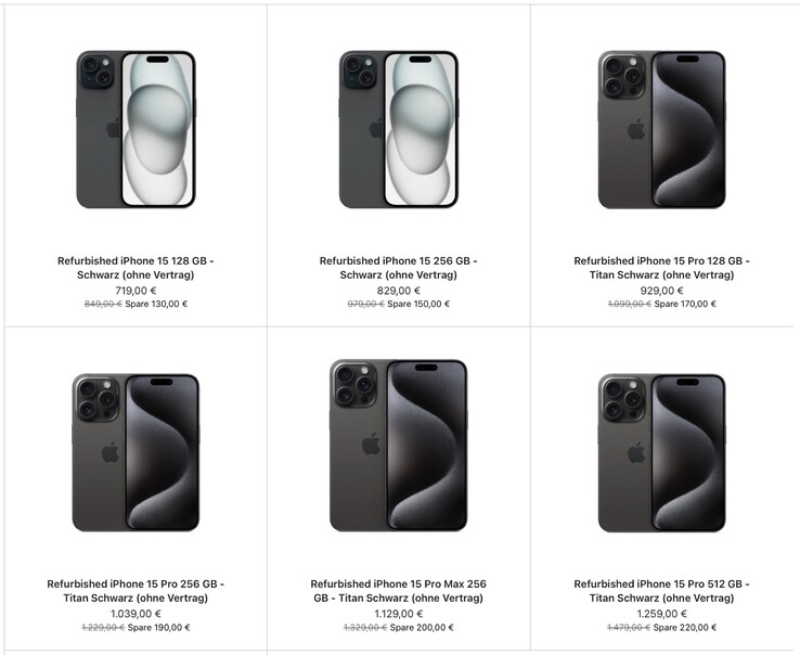 Das Apple iPhone 15, das iPhone 15 Pro und das iPhone 15 Pro Max können ab sofort auch generalüberholt im Apple Online Store Deutschland bestellt werden. Aktuell sind nur Modelle in Schwarz auf Lager. Beim günstigsten iPhone 15 mit 128 GB Speicher gewährt Apple einen Rabatt von 130 Euro im Vergleich zum Listenpreis, wodurch das Smartphone noch 719 Euro kostet, ein iPhone 15 Pro mit 256 GB Speicher wird mit 190 Euro Rabatt für 1.039 Euro angeboten, ein iPhone 15 Pro Max mit 512 GB Speicher gibts mit 240 Euro Rabatt für 1.339 Euro.