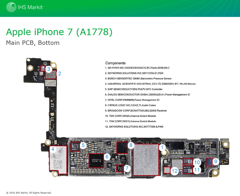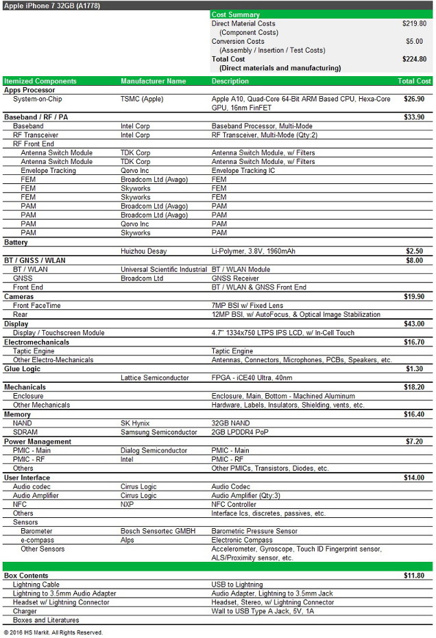 Der IHS Markit Teardown verrät, dass die Produktionskosten für das neue iPhone 7 von Apple um rund 18 Prozent höher liegen, als für das iPhone 6s Modell aus dem Vorjahr. Laut der Materialliste (BOM, Bill of Materials) für das iPhone 7 mit 32 GB (A1778) fallen Herstellungskosten in Höhe von knapp 225 US-Dollar an. In den USA zahlt der Kunde dann für das iPhone 7 32 GB ohne Mobilfunkvertrag bei Apple 649 Dollar plus Tax.
