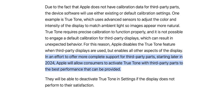 Wird dagegen ein Display durch ein Drittanbieter-Ersatzteil getauscht, wird True Tone in Zukunft nicht mehr gesperrt. Dieses Feature nutzt den Umgebungslichtsensor des iPhones, um die Farbtemperatur des Displays auf das Umgebungslicht abzustimmen. Apple gibt an, dass True Tone bisher deaktiviert wurde, da die Kalibrierung des Panels nicht überprüft werden kann, sodass True Tone unter Umständen nicht korrekt funktioniert.