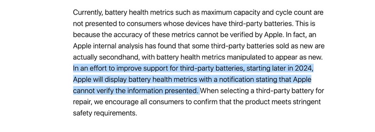 In einem neuen Support-Dokument, in dem Apple die Nachhaltigkeit der eigenen Produkte bewirbt, verspricht der iPhone-Hersteller nun Besserung, zumindest bei zwei Komponenten. Einerseits können iPhones künftig die verbleibende Kapazität eines Drittanbieter-Akkus anzeigen, wobei iPhones weiterhin eine Warnung einblenden werden, dass es sich bei der verbauten Batterie um kein Original-Ersatzteil handelt.