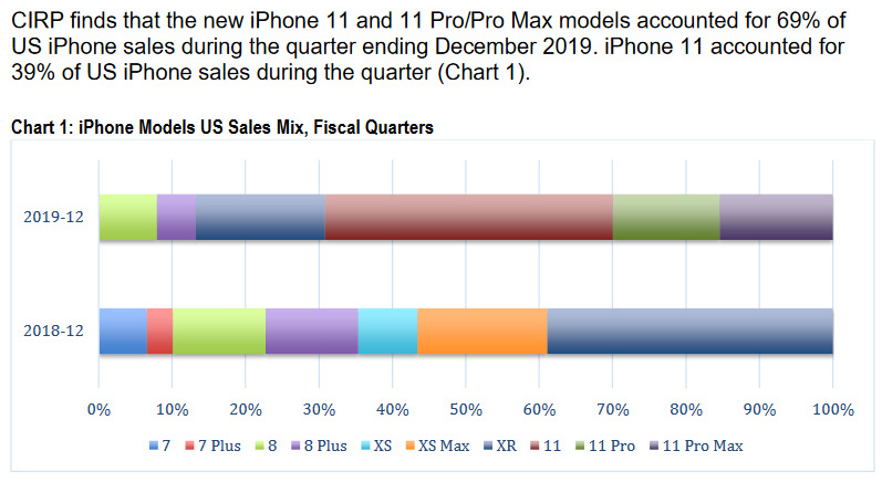 In den USA ist die aktuelle iPhone 11-Serie sehr beliebt. Wie eine aktuelle Analyse der Marktforscher von Cirp für den US-Markt zeigt, machten im Schlussquartal des Vorjahres die neuen Apple-Modelle iPhone 11, iPhone 11 Pro und iPhone 11 Pro Max zusammen rund 69 Prozent der gesamten iPhone-Verkäufe im Quartal in den USA aus. Alleine 39 % der iPhone US-Verkäufe entfielen auf das iPhone 11.