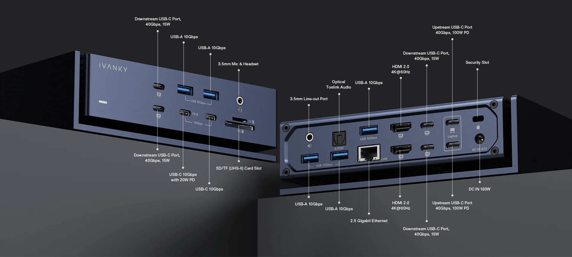 Insgesamt bietet die iVanky Docking Station Ultra 20-in-1 satte 20 Anschlüsse. Neben zweimal USB-C-Upstream mit 40 Gbit/s und 100 W PD stehen diverse weitere USB-C-Ports mit hohen Datenrate von bis zu 40 Gbit/s und maximal 20 W PD zur Verfügung. Dazu kommen fünf USB-A-Anschlüsse mit bis zu 10 Gbt/s, einmal 2,5-Gigabit-LAN, divers Audio-Ports samt optischem Toslink, SD/TF-Kartenleser sowie ein 180-W-Stromanschluss.