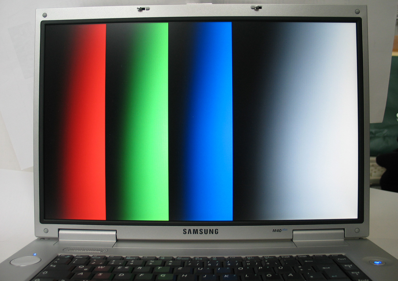 Im Gegensatz zur Tastatur ist der Einschalter etwas wackelig. Die Plastikkante an der Vorderseite des Notebooks fühlt sich nach längerem Tippen etwas unangenehm am Unterarm an. Der Effekt braucht jedoch nicht überbewertet werden. Störend ist der seitliche Bildschirmanschluß (vorallem für Rechtshänder, die hier normalerweise eine Maus zum arbeiten benutzen und einen externen Bildschirm angeschlossen haben). Die Lüftung saugt die Luft von der Unterseite des Notebooks an. Diese Ansaugung kann beeinträchtigt oder gar unterbunden werden, falls man auf weicher Unterlage arbeitet. BildschirmDie maximale Ausleuchtung des Displays beträgt 167,9 cd/m². Mit diesem hohen Helligkeitswert ist das Samsung M40 Plus auch für einen Einsatz unter freien Himmel bei Sonneneinstrahlung geeignet. Die abgesenkte Blaukurve trübt die ansonsten angenehm regelmässige Farbdarstellung. Der darstellbare Farbraum ist überdurchschnittlich für Notebookpanels.
