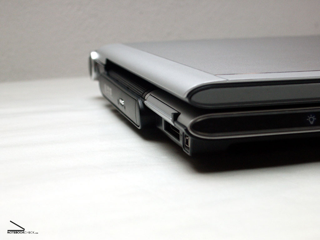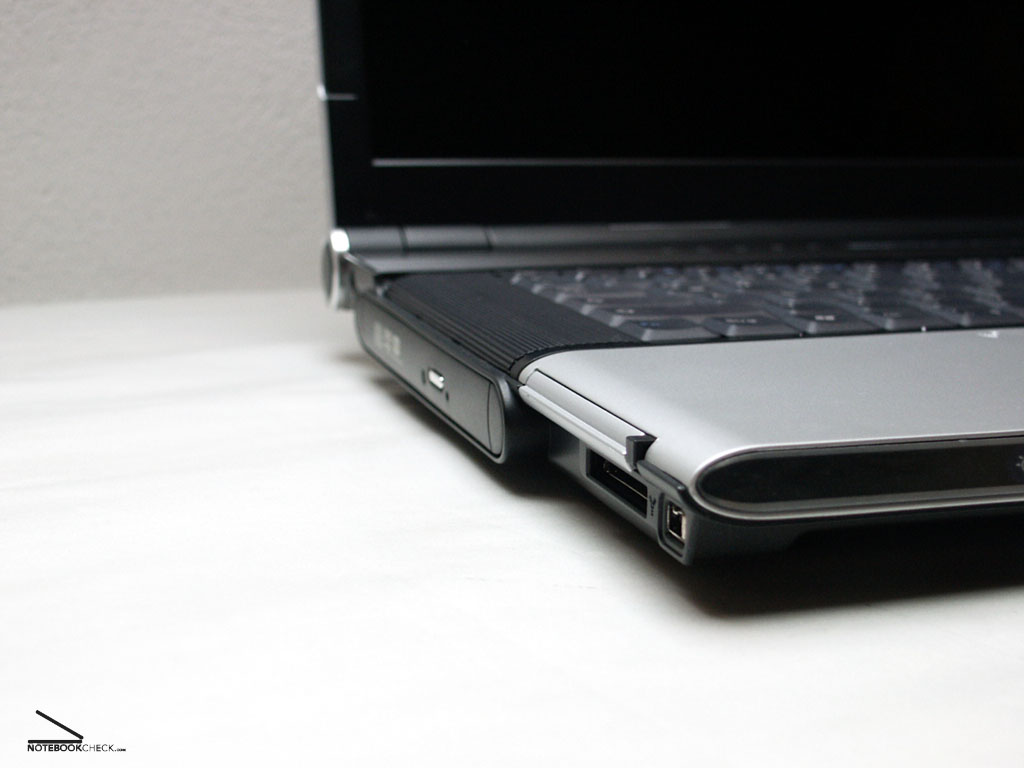 Die linke Geräteseite beinhaltet das DVD+/- RW Laufwerk, den 4-in-1 Card Reader, PCMCIA Adapter mit eingeschobenen Dummy sowie eine Kensington Lock Buchse.