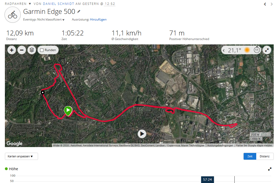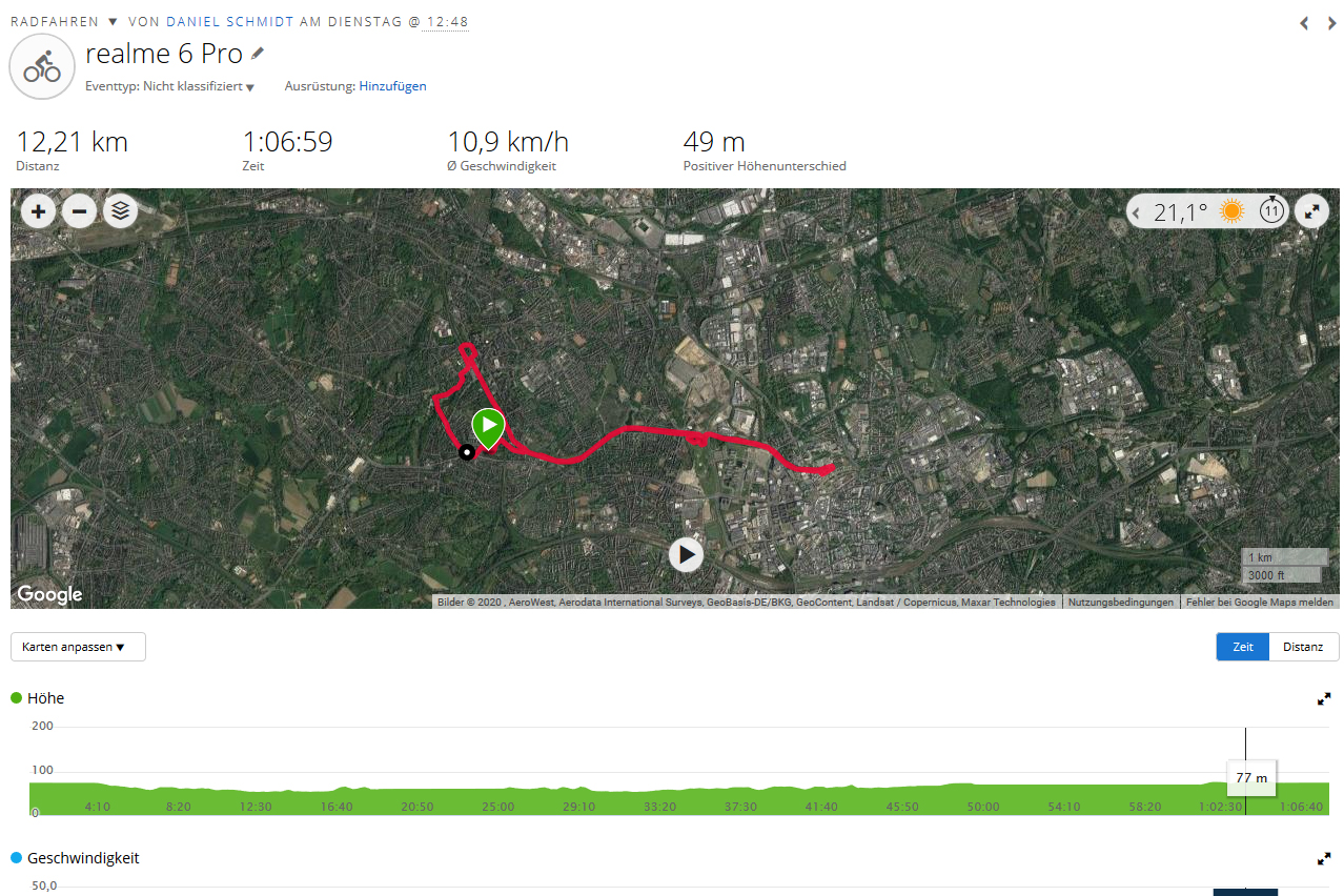 Im Vergleich mit unserem Referenzgerät Garmin Edge 500 zeigt das realme 6 Pro etwas stärkere Abweichungen in Kurven und eine ähnliche Toleranz auf längeren Geraden. Damit ist es ausreichend gut für Navigationsaufgaben geeignet.