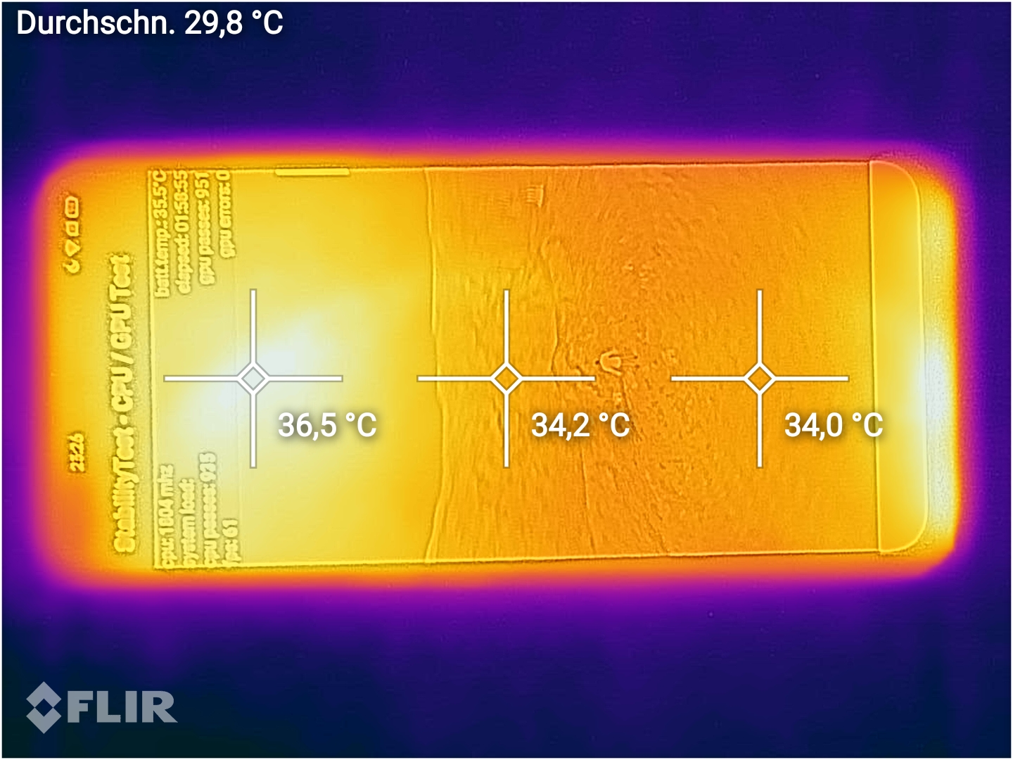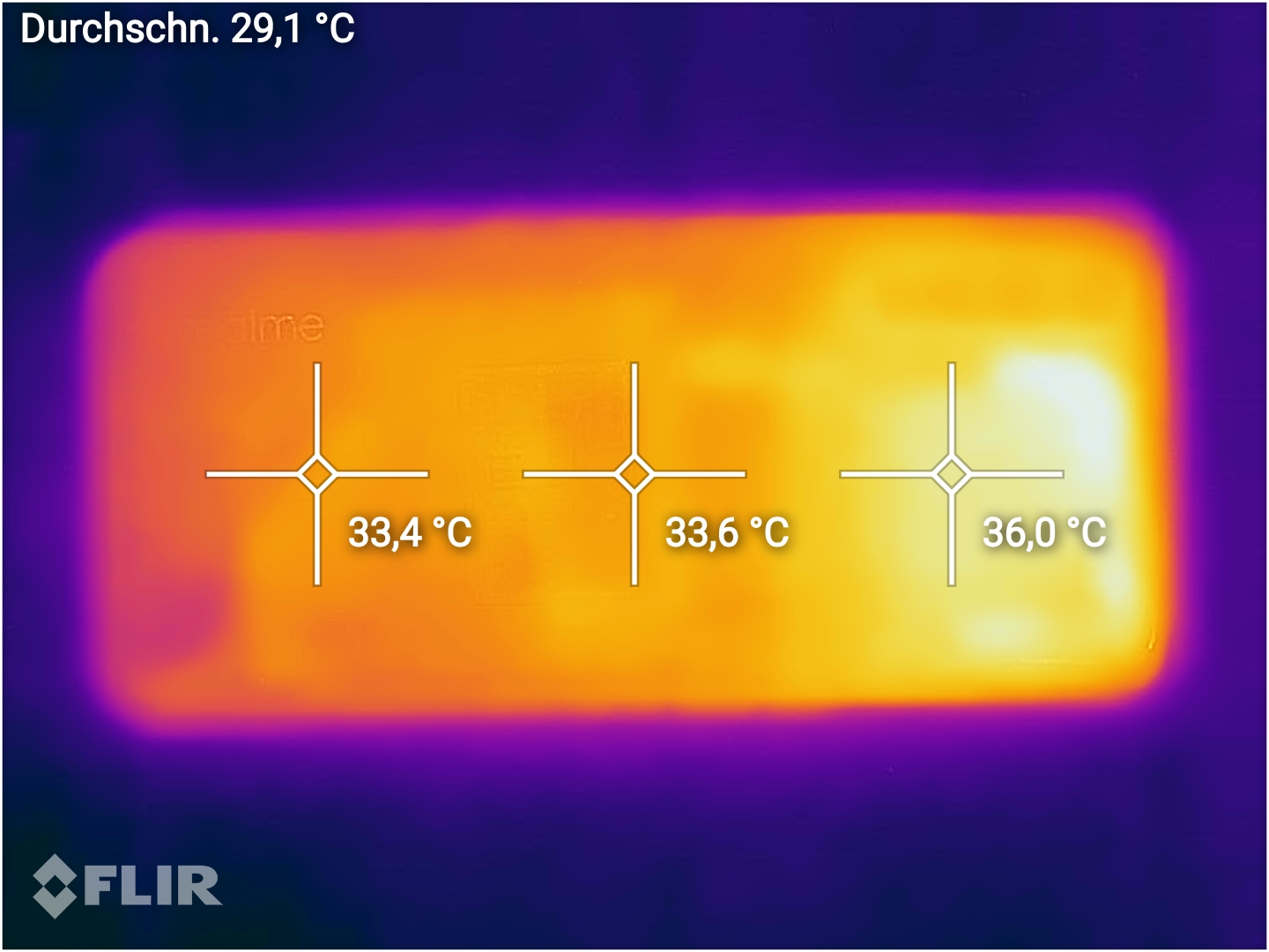 Unsere Messungen bescheinigen dem realme 6 Pro Oberflächentemperaturen von bis zu 33,6 °C unter Last. Damit erwärmt es sich nur moderat und lässt sich auch über einen längeren Zeitraum problemlos verwenden.