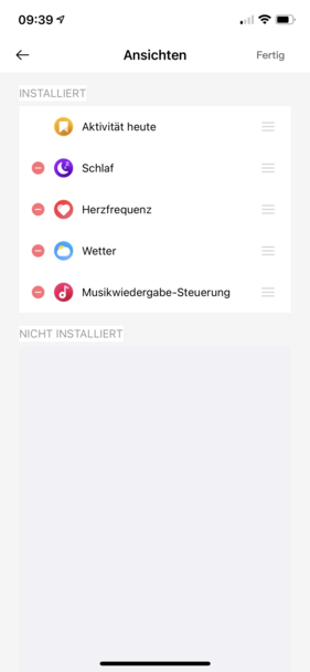 In der App setzt man Erinnerungen für Bewegung und Flüssigkeitsaufnahme sowie Alarme und das Intervall für die Überwachung der Herzfrequenz. Die auf der Watch 2 Pro installierten Apps und Widgets lassen sich über realme Link sortieren und einzeln ausblenden.