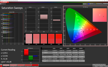 Für OLEDs sind das nicht messbare Kontrastverhältnis und ein Schwarzwert von 0 cd/m² ebenfalls typisch. Die CalMAN-Analyse zeigt außerdem, dass Farben im Modus "Standard" mit einem etwas zu hohen Blauanteil angezeigt werden. Nutzer können die Farbtemperatur auf "Warm" ändern, wodurch ein ausgeglicheneres Bild entsteht.